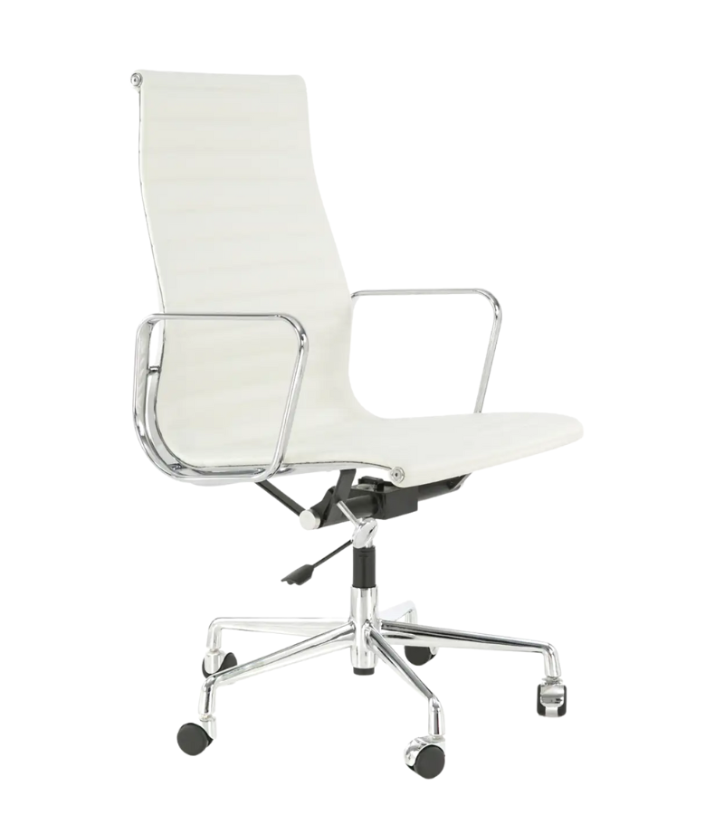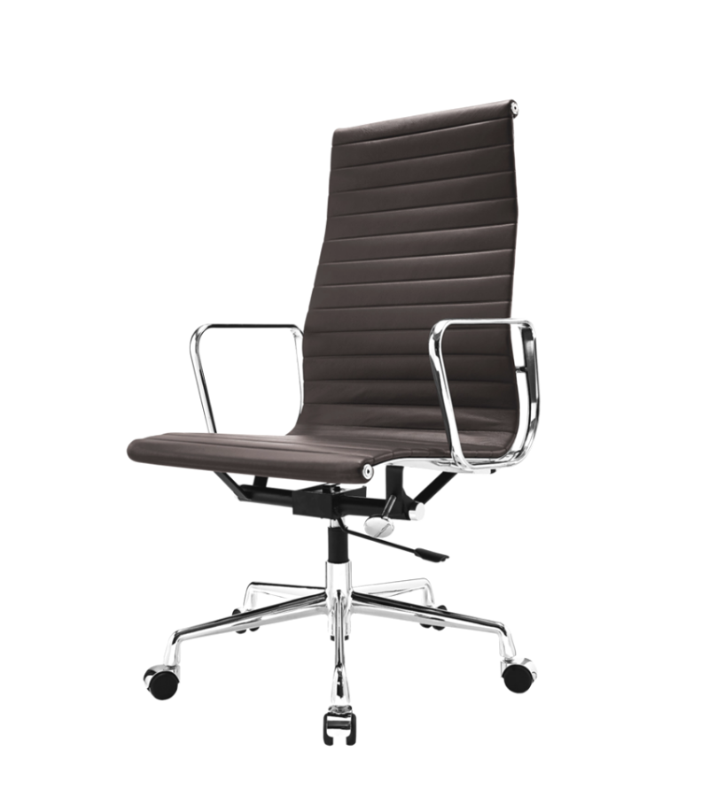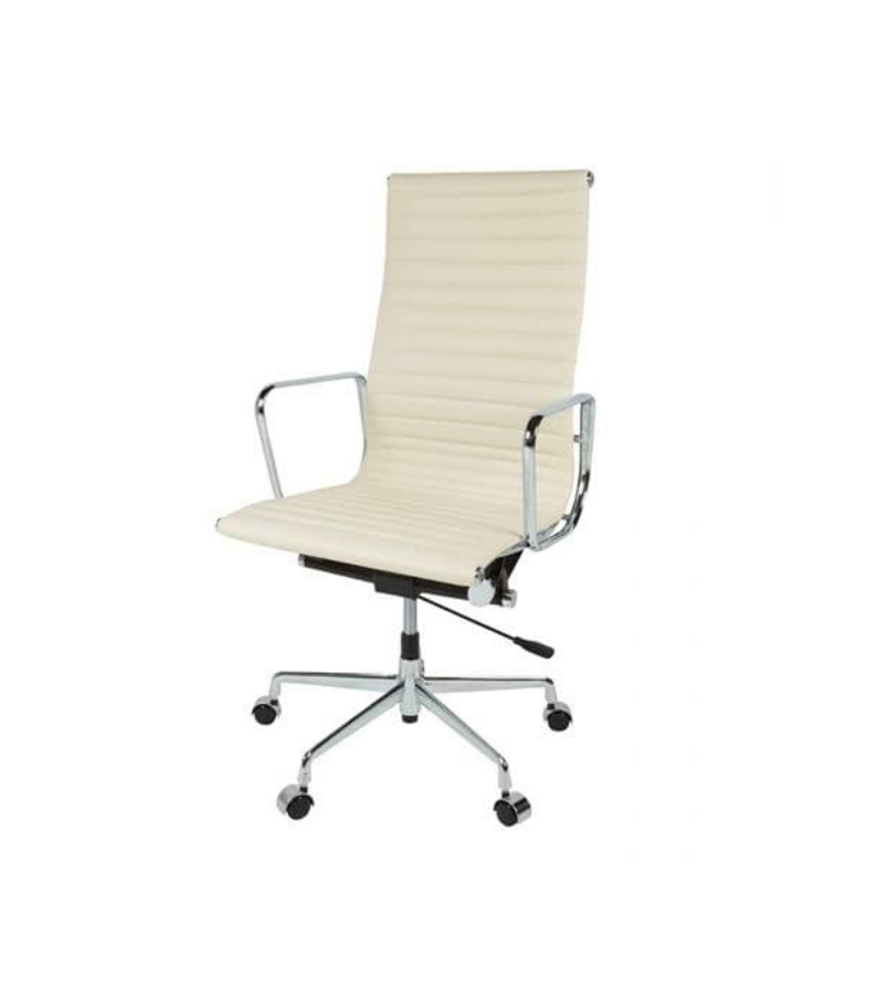 A high back Eames style office chair with a ribbed design in premium leather upholstery on a chromed aluminium frame.
