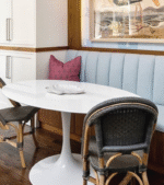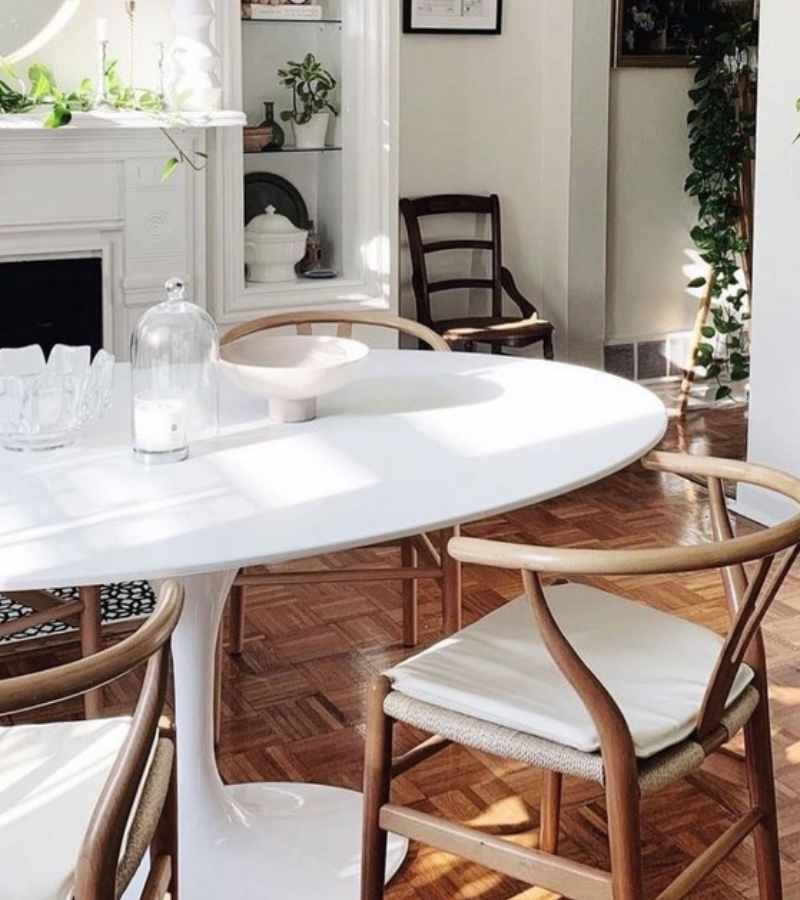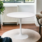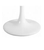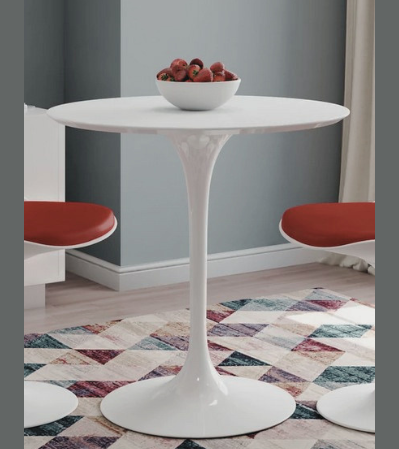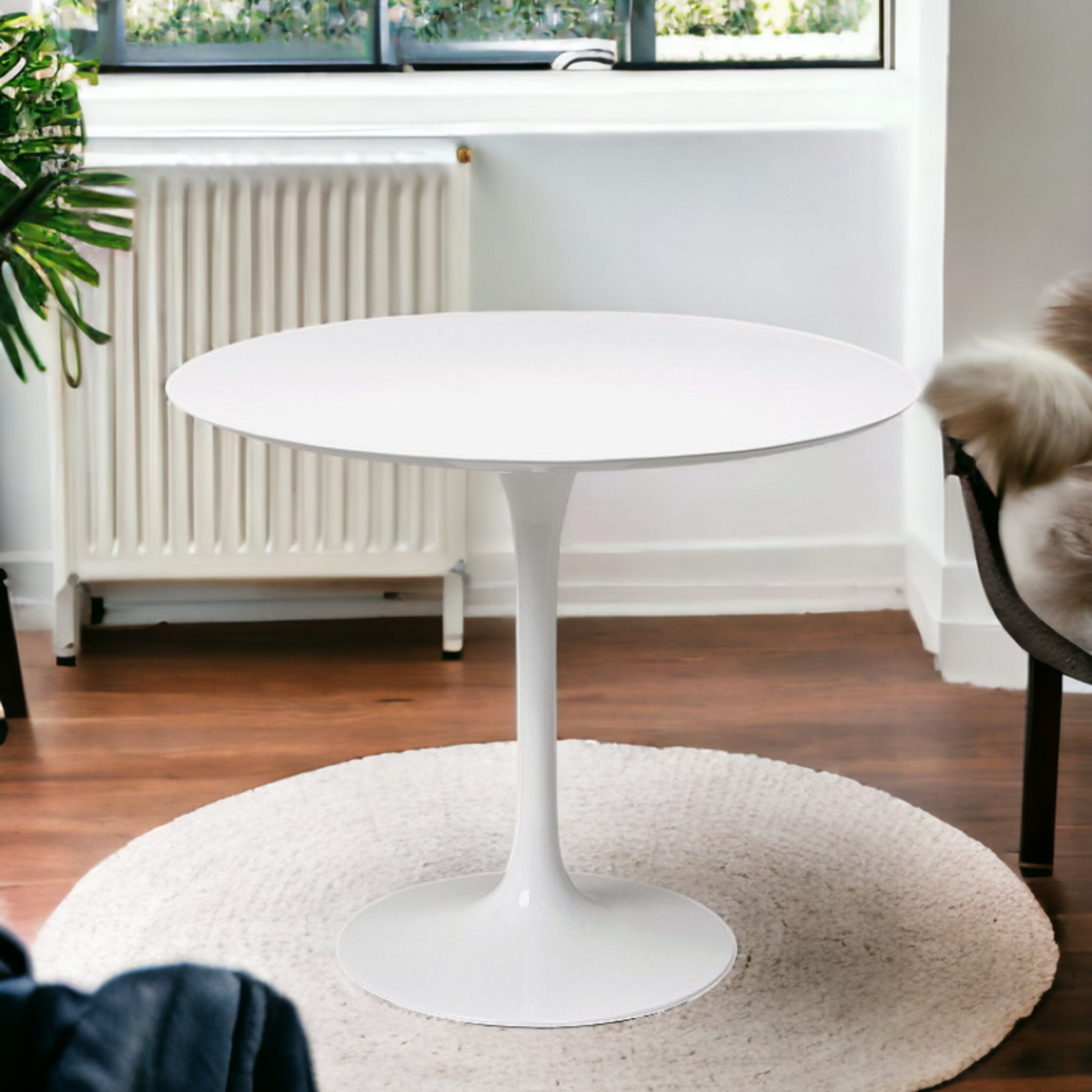 A tulip style dining table with a lacquered white wooden table top with an elegant tapered edge on a matching gloss white aluminium base.